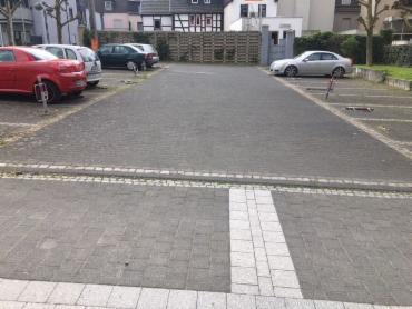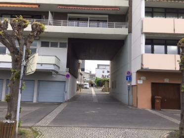 Ansicht der Einfahrt zum Stellplatz von der Rheinallee.
